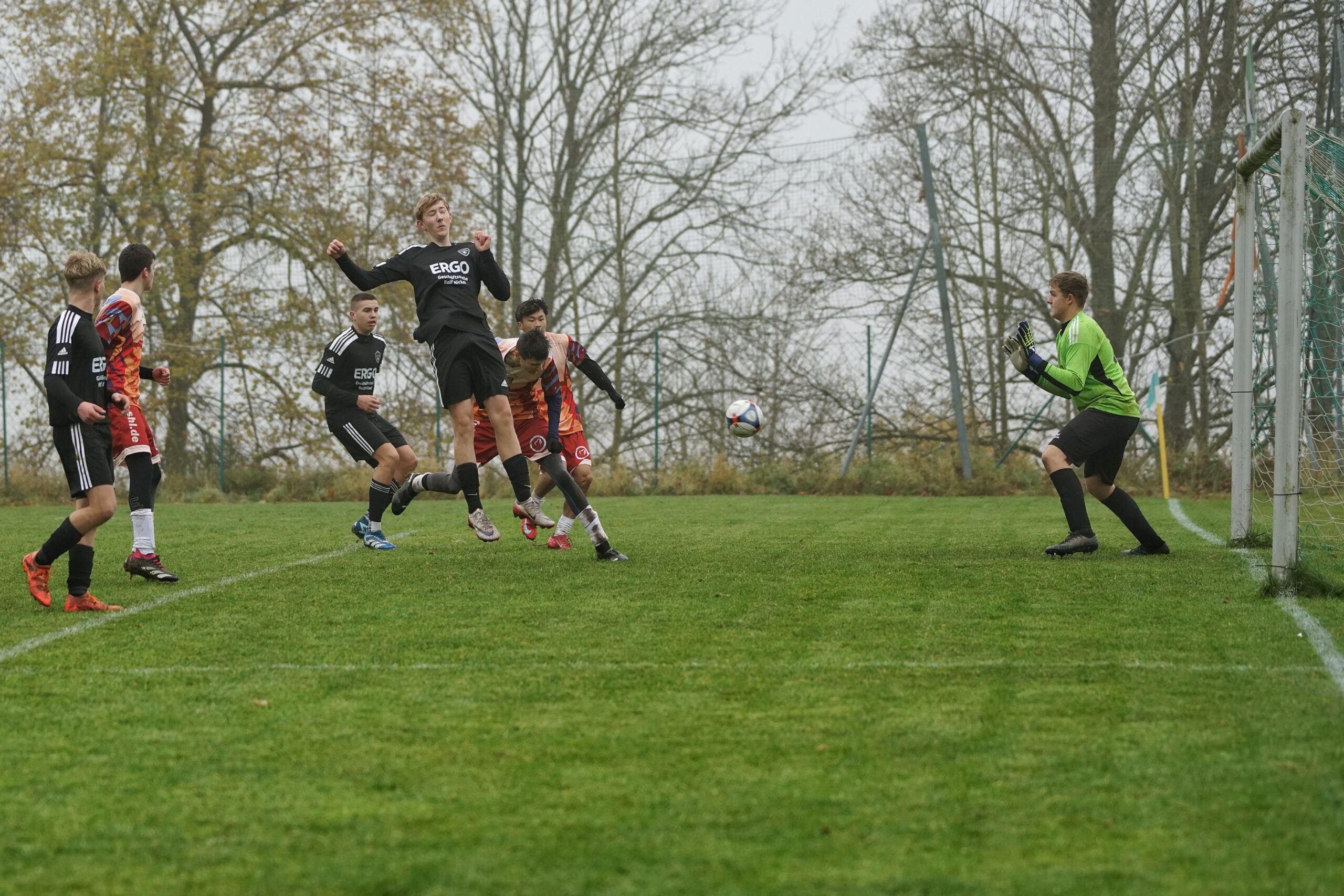 Weiter ging es auch schon mit den letzten 45 Punktspielminuten für dieses Jahr. Die Gäste waren mit Anpfiff gleich druckvoller am Start. Erste kleine Fehler schlichen sich unserseits im Passspiel dadurch ein. Ein Ballverlust mündete in einer Bogenlampe, die zwischen den Fingern vom Keeper und der Latte zum 0:1 ins Tor passte.